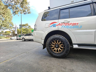 A clean and aggressive Mitsubishi Pajero build featuring LENSO MARVEL 17x9 Dirty Bronze wheels paired with Maxxis AT811 265/65R17 all-terrain tyres — perfect for both daily driving and off-road use.