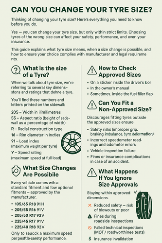 Yes — you can change your tyre size, but only within strict limits. Choosing tyres of the wrong size can affect your safety, performance, and even your insurance.