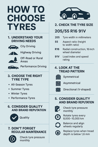 Choosing the right tyres doesnât have to be complicated. Focus on your driving habits, climate, and car manufacturerâs recommendations. Invest in a reliable brand, check manufacturing dates, and maintain your tyres for longer performance.