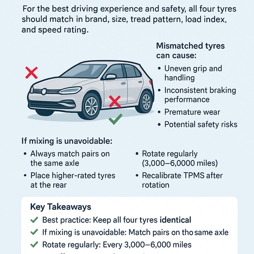 While it might seem convenient or cost-effective to mix tyres, doing so can compromise your vehicle’s balance, control, and safety. Matching tyres across all wheel positions ensures optimal grip, predictable handling, and peace of mind — no matter the weather or road conditions.
