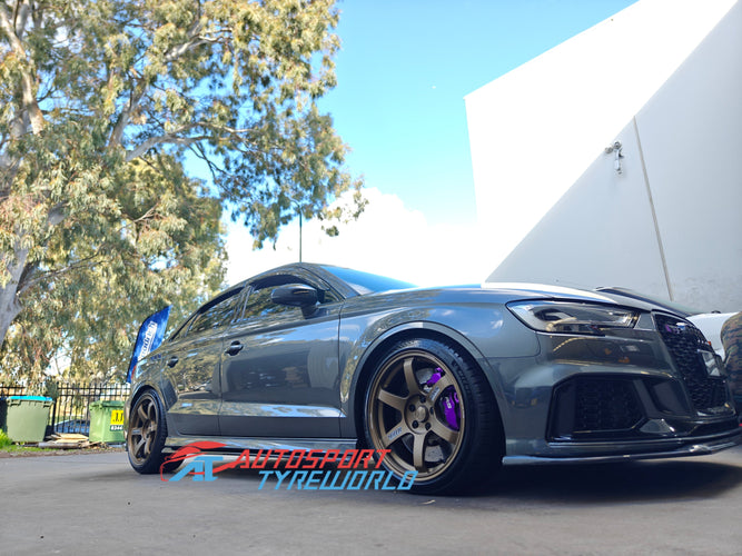 An Audi RS3 upgraded at Autosport Tyreworld with Volk Racing TE37SAGA S-Plus Bronze wheels and Michelin PS5 tyres. A perfect combination of lightweight performance and premium grip.