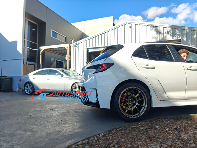 A Toyota GR Corolla upgraded with WedsSport TC105X wheels and Yokohama AD09 tyres, delivering improved grip, sharper handling, and an aggressive motorsport stance