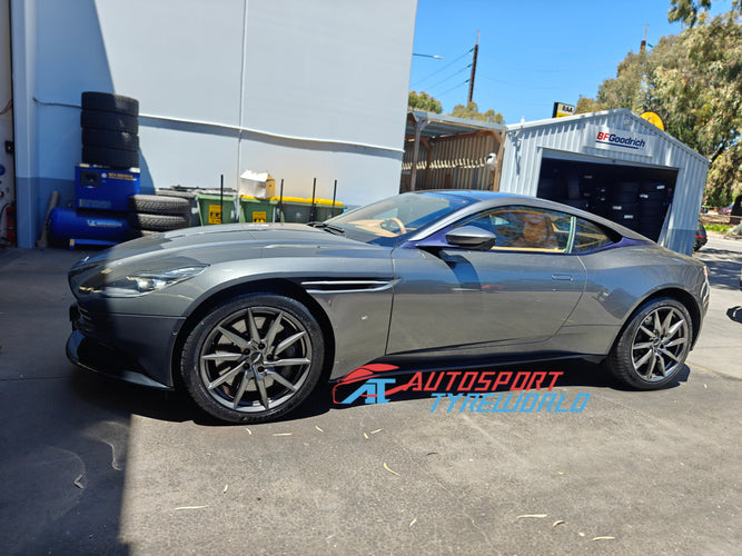 Aston Martin DB11 upgraded with Michelin Pilot Sport 4S tyres at Autosport Tyre World. Front 255/40R20 and rear 295/35R20 expertly fitted with precision mounting, balancing, and premium service. Book your performance tyre upgrade today.