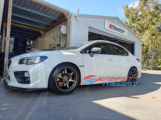 A Subaru WRX upgraded with custom Liquid Bronze Rays 57CR wheels and Kumho 245/40R18 tyres — installed by Autosport Tyreworld for enhanced performance and style.
