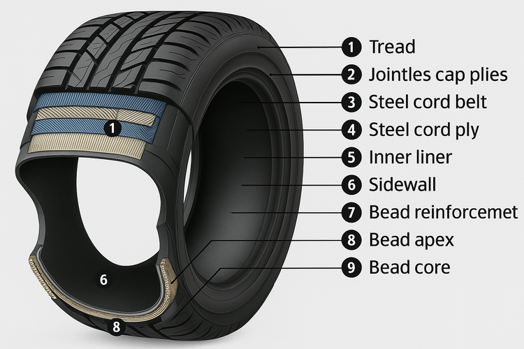 Cap: The top layer that contacts the road. It ensures optimal grip, wear resistance, and directional stability.