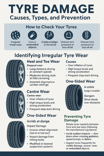 Tyres can become damaged for a variety of reasons — and not all of them are immediately visible. From punctures and cracks to bulges and uneven wear, understanding the causes and early warning signs of tyre damage is essential for safe driving.