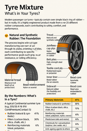 Modern passenger car tyres typically contain over 25 components and up to 12 different rubber compounds. Each material contributes to safety, comfort, and performance.