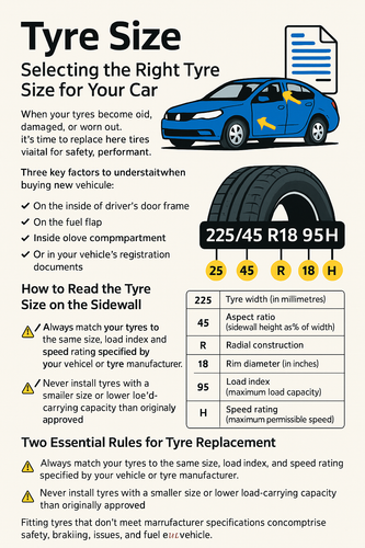 When in doubt, consult your vehicle manufacturer, tyre dealer, or approved test centre. They can confirm which tyre sizes are safe, legal, and certified for your car — ensuring every journey remains smooth, efficient, and secure.