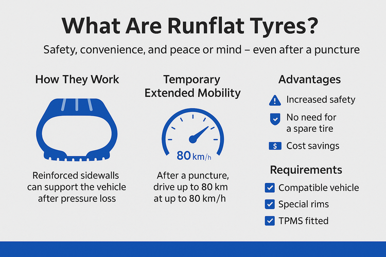 Runflat tyres are built with reinforced sidewalls that can temporarily support the vehicle’s weight even after a complete loss of air pressure.